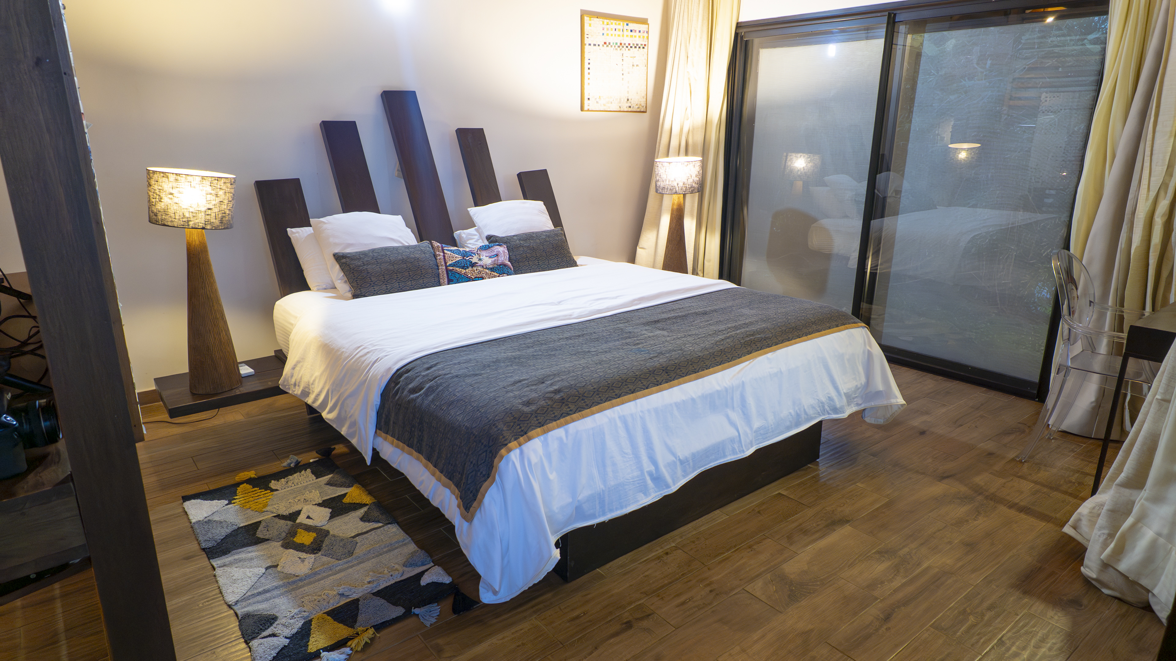 Les bungalows vous proposent un confort inégalé. Décorés par une décoratrice ivoirienne, les tissus Aissa Dione ornent cette magnifique chambre.