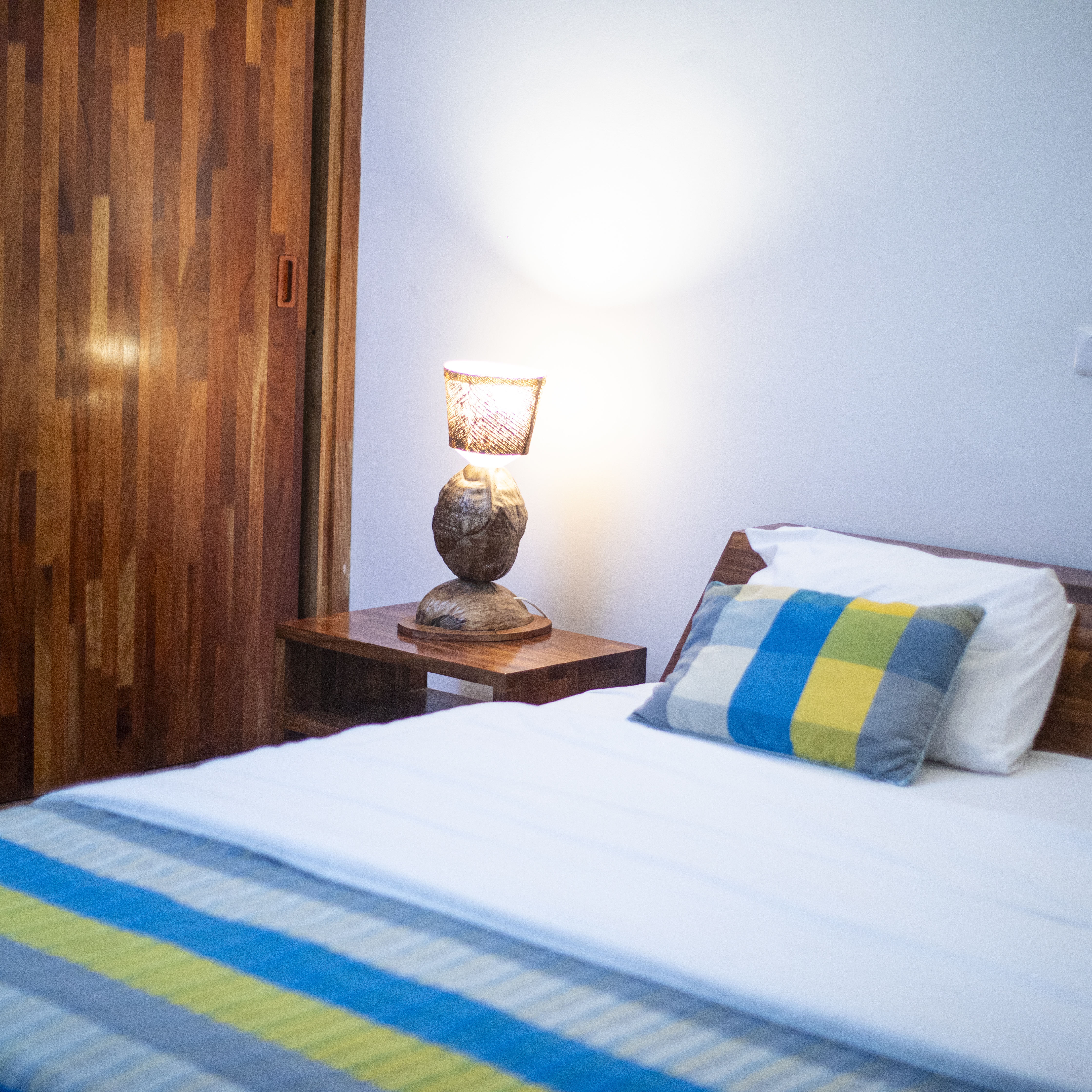 La chambre confort est la chambre idéale pour une courte visite aux Marines de Babihana, décorée par une décoratrice ivoirienne, elle est également dressée avec les tissus Aissa Dione.